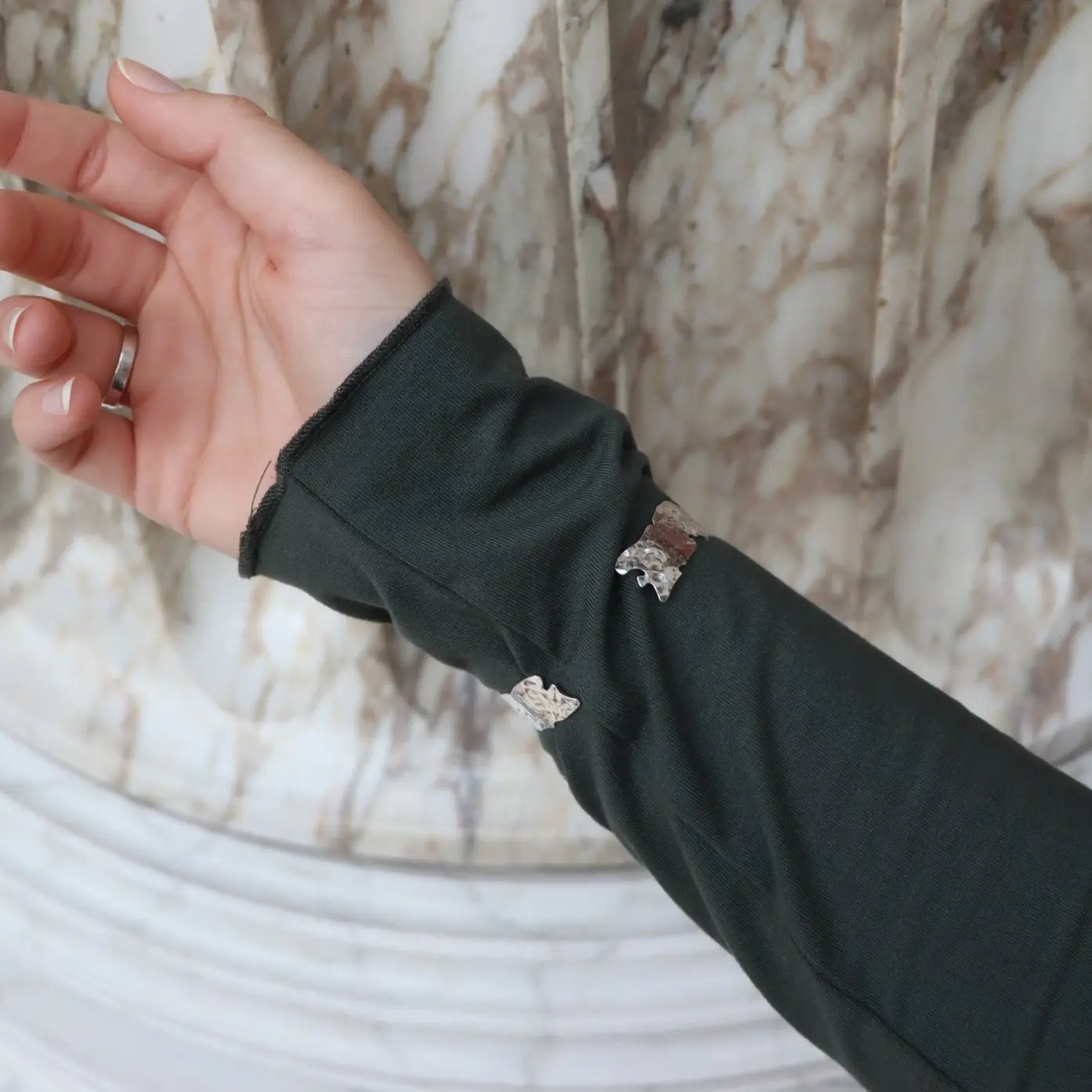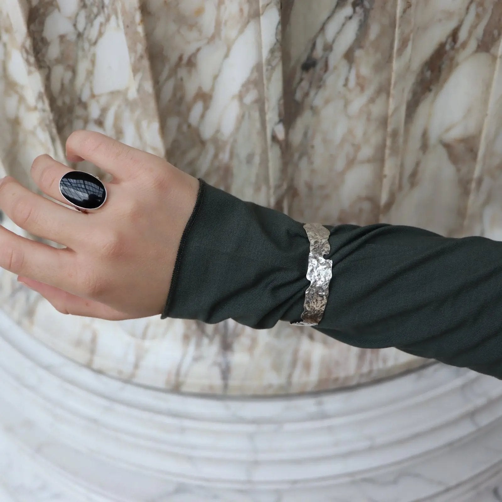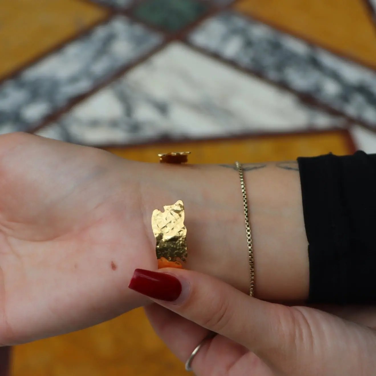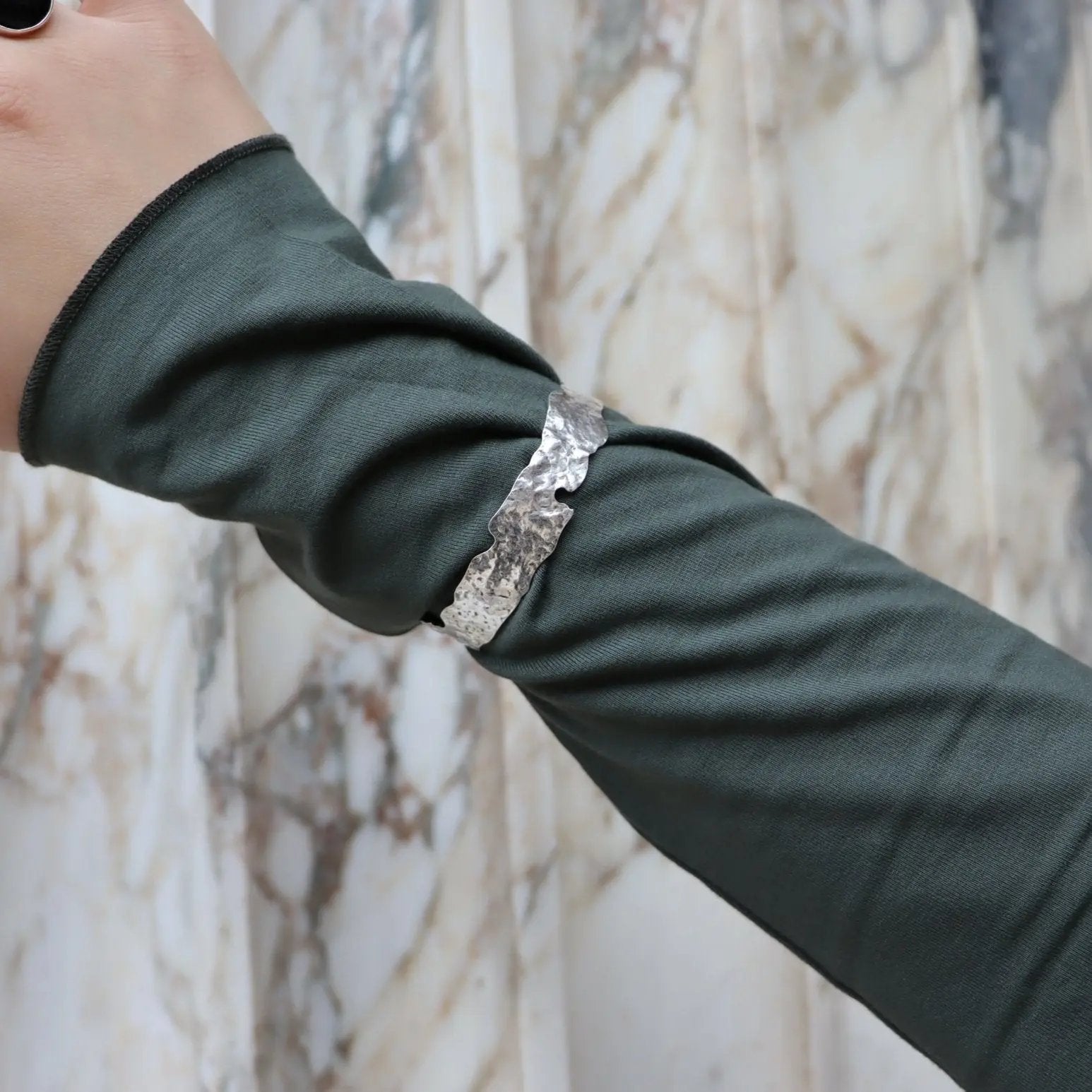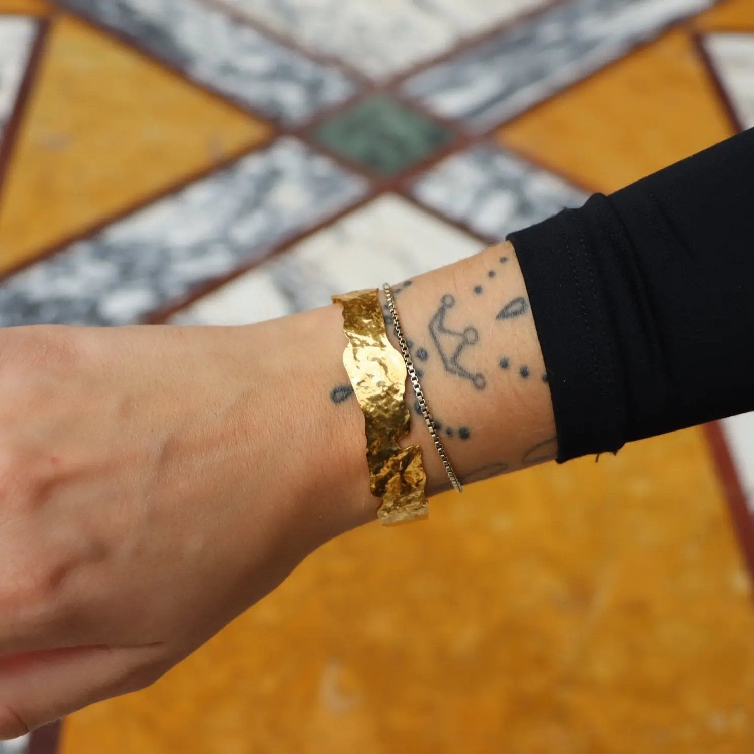Entdecken Sie Eleganz und Einfachheit, die in unserem Armband vereint sind, und kombinieren Sie vergoldete und versilberte Messing in einem einzigartigen organischen Design. Dieses offene Armband schleicht sich natürlich um Ihr Handgelenk und verleiht jeder Gelegenheit einen Hauch von Luxus. Mit den Abmessungen passt es 62 x 50 mm wunderschön und verleiht eine herausragende, aber raffinierte Präsenz.