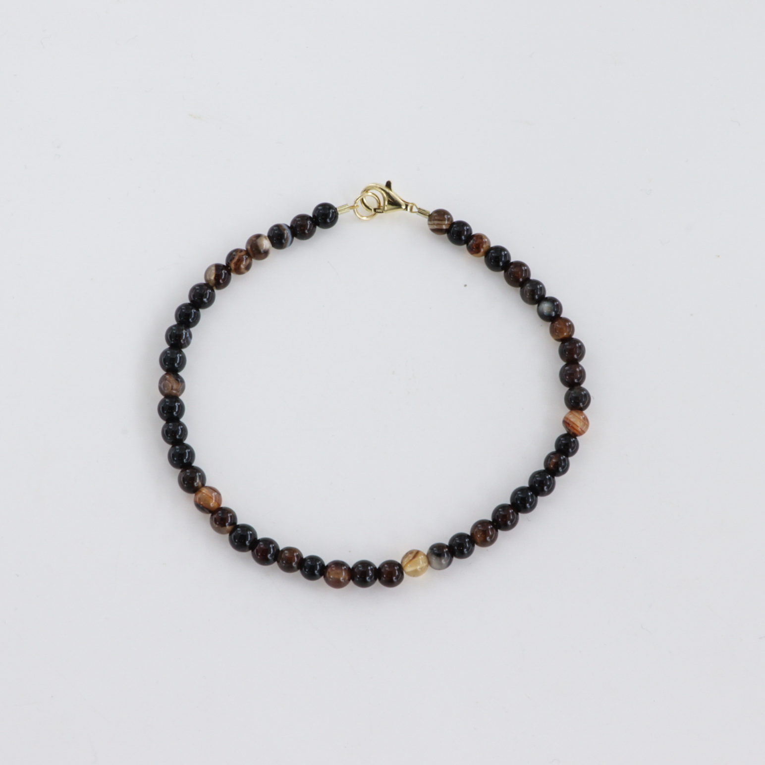 Naturligt og varmt armbånd med runde perler i brun agat mix. Stenene varierer i nuancer fra lys beige og honning til dybere bruntoner, hvilket giver hvert armbånd sit helt eget unikke udtryk. De glatte, polerede perler skaber et roligt og harmonisk look.