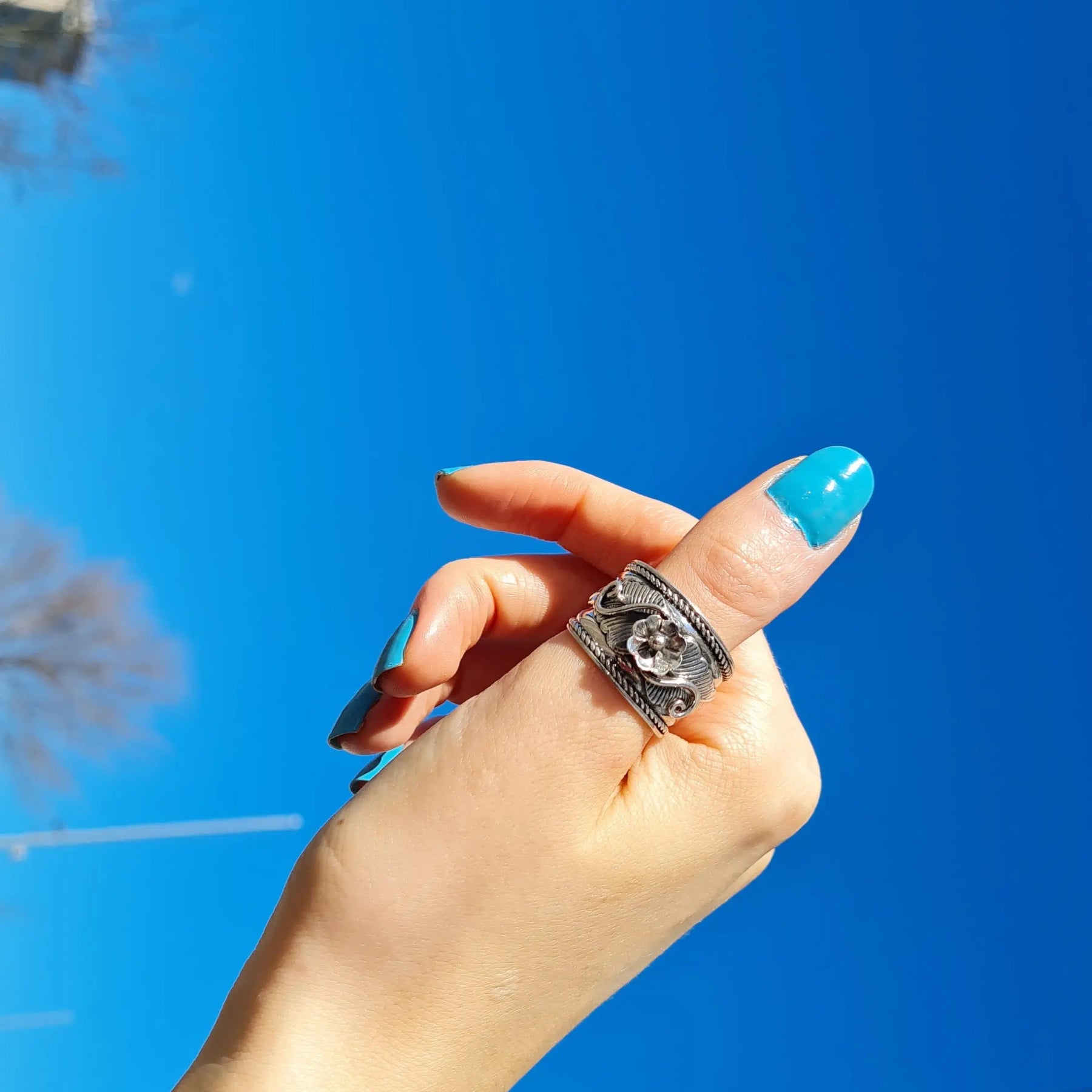 Fingern, breites Band mit Blume, Sterlingsilber