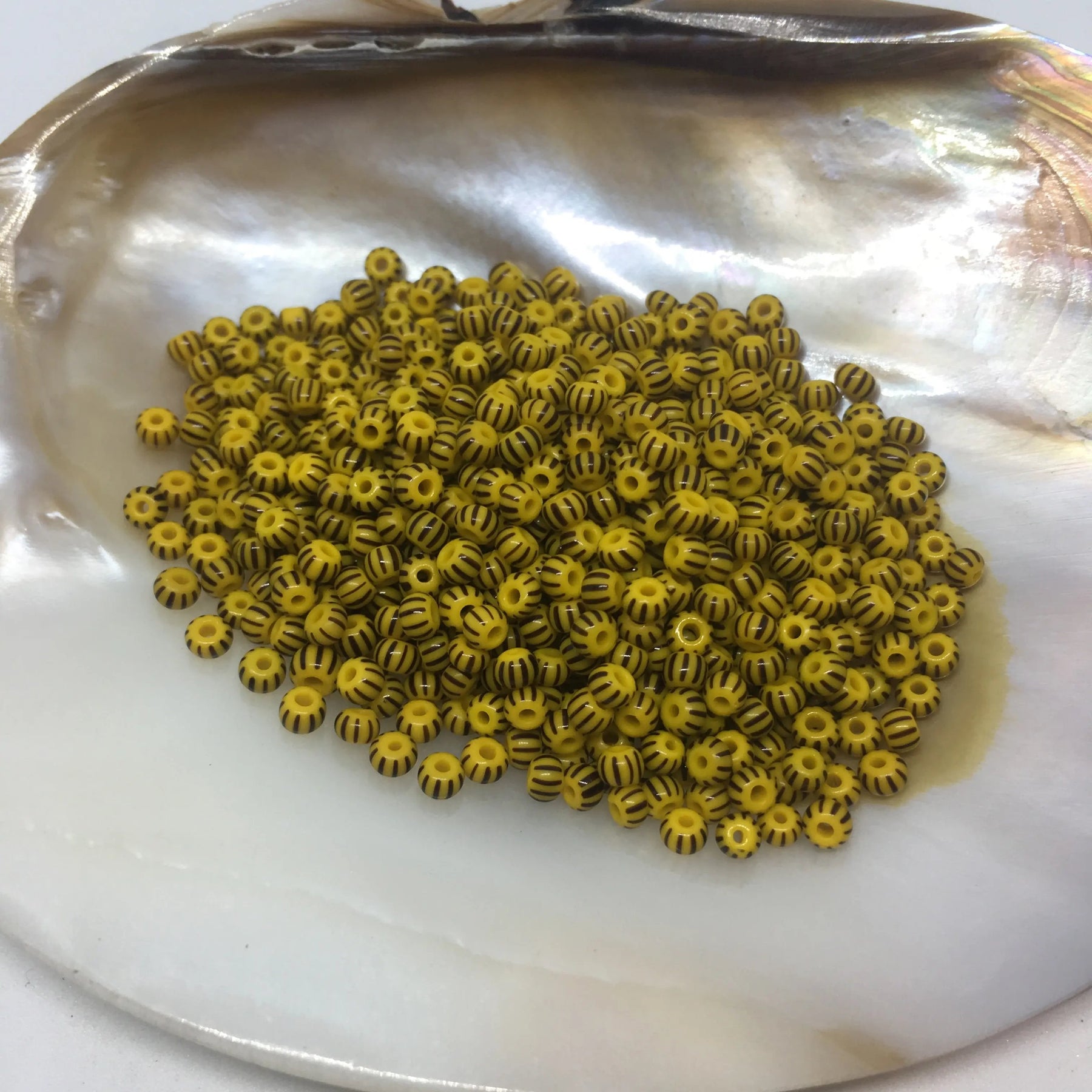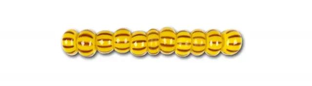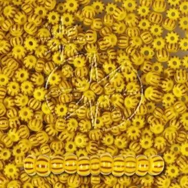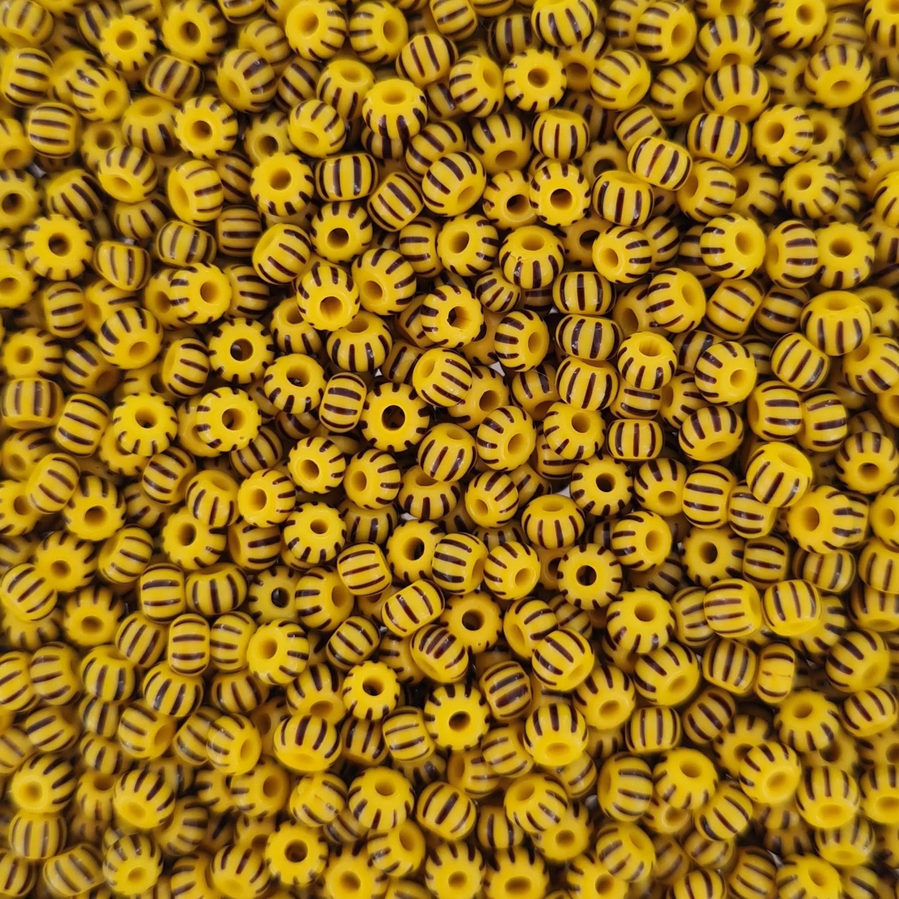 Kleine gelbe Glasperlen mit dichten schwarzen Streifen.