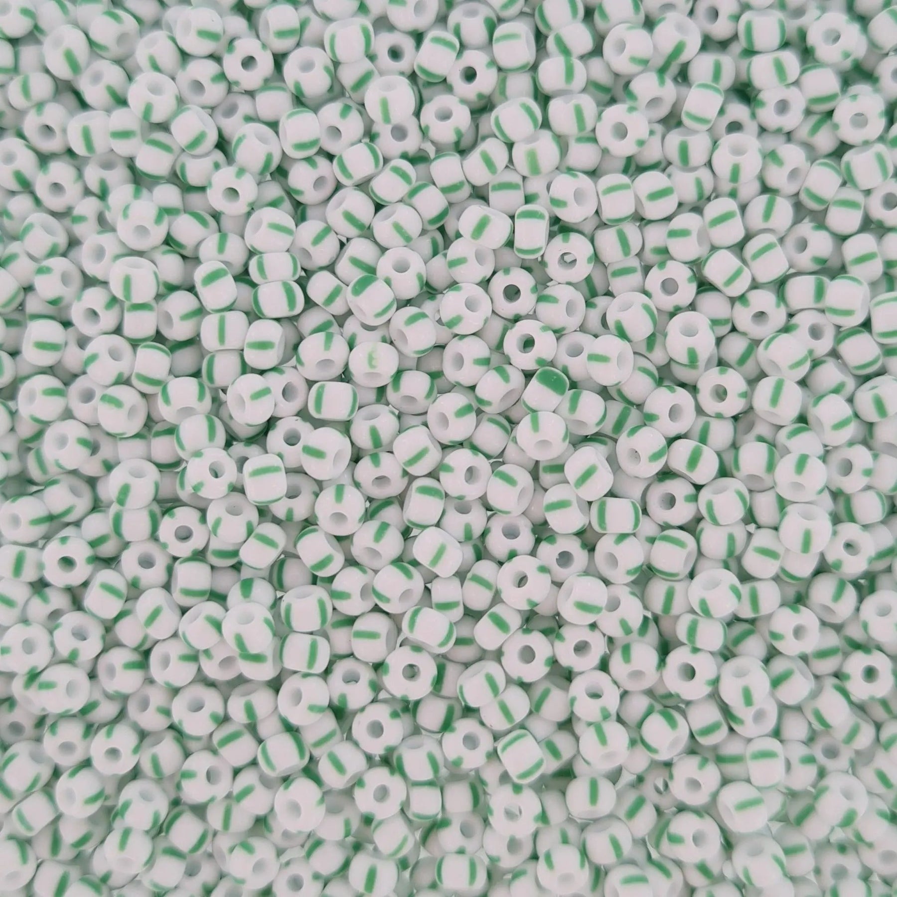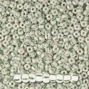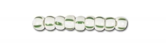 Kleine weiße Glasperlen mit vier grünen Streifen.