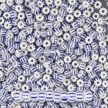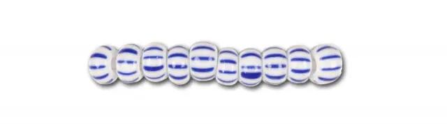 Kleine weiße Glasperlen mit dichten dunkelblauen Streifen.