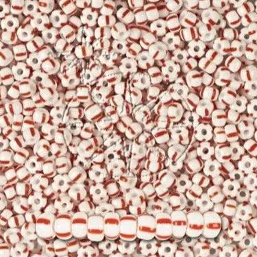 Kleine weiße Glasperlen mit vier roten Streifen.
