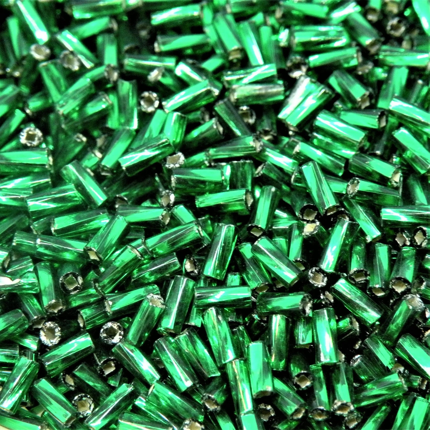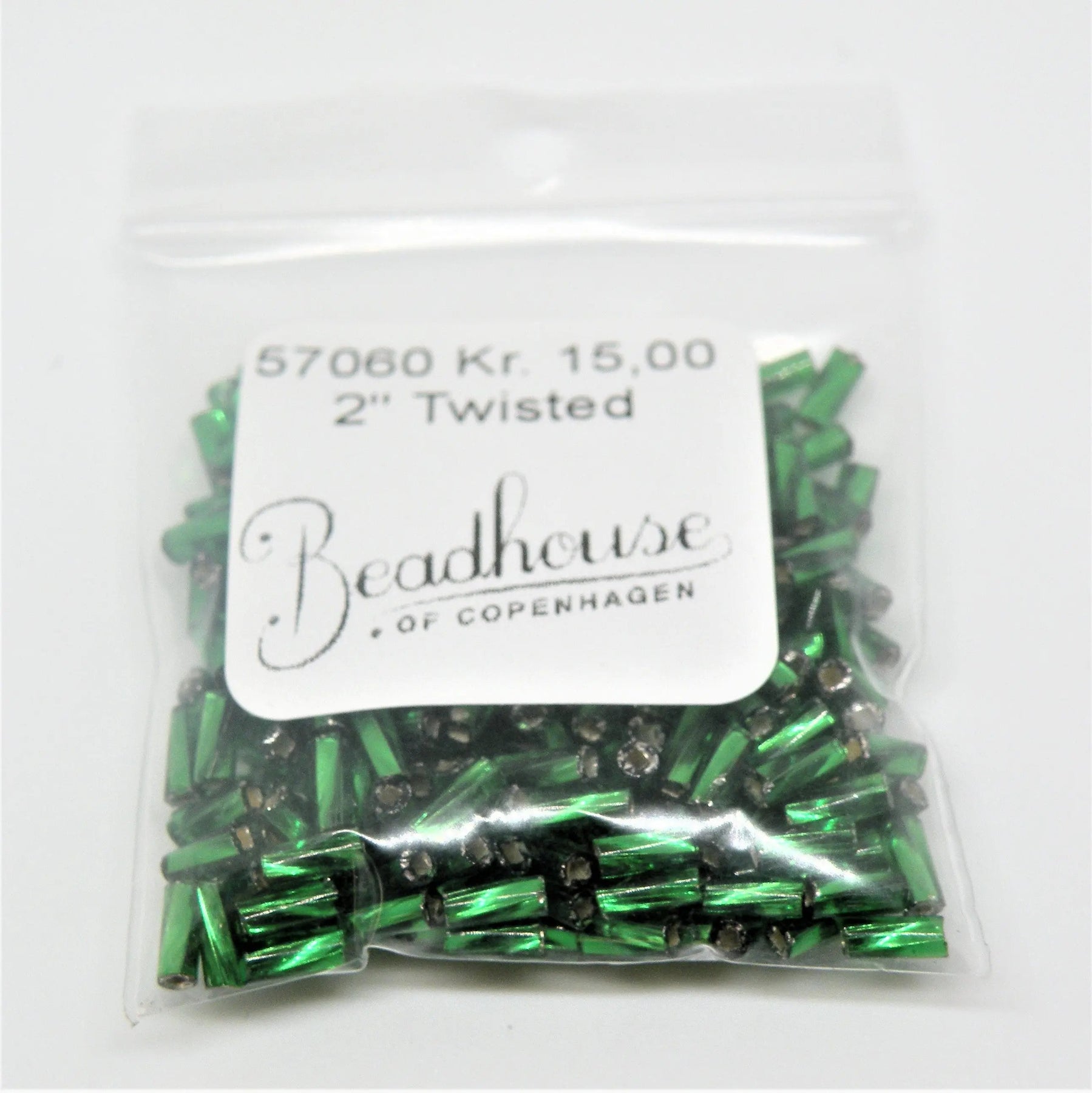Kleine verdrehte grün preciosa geschnittene röhrenförmige Glasperlen mit Silberstreifen.