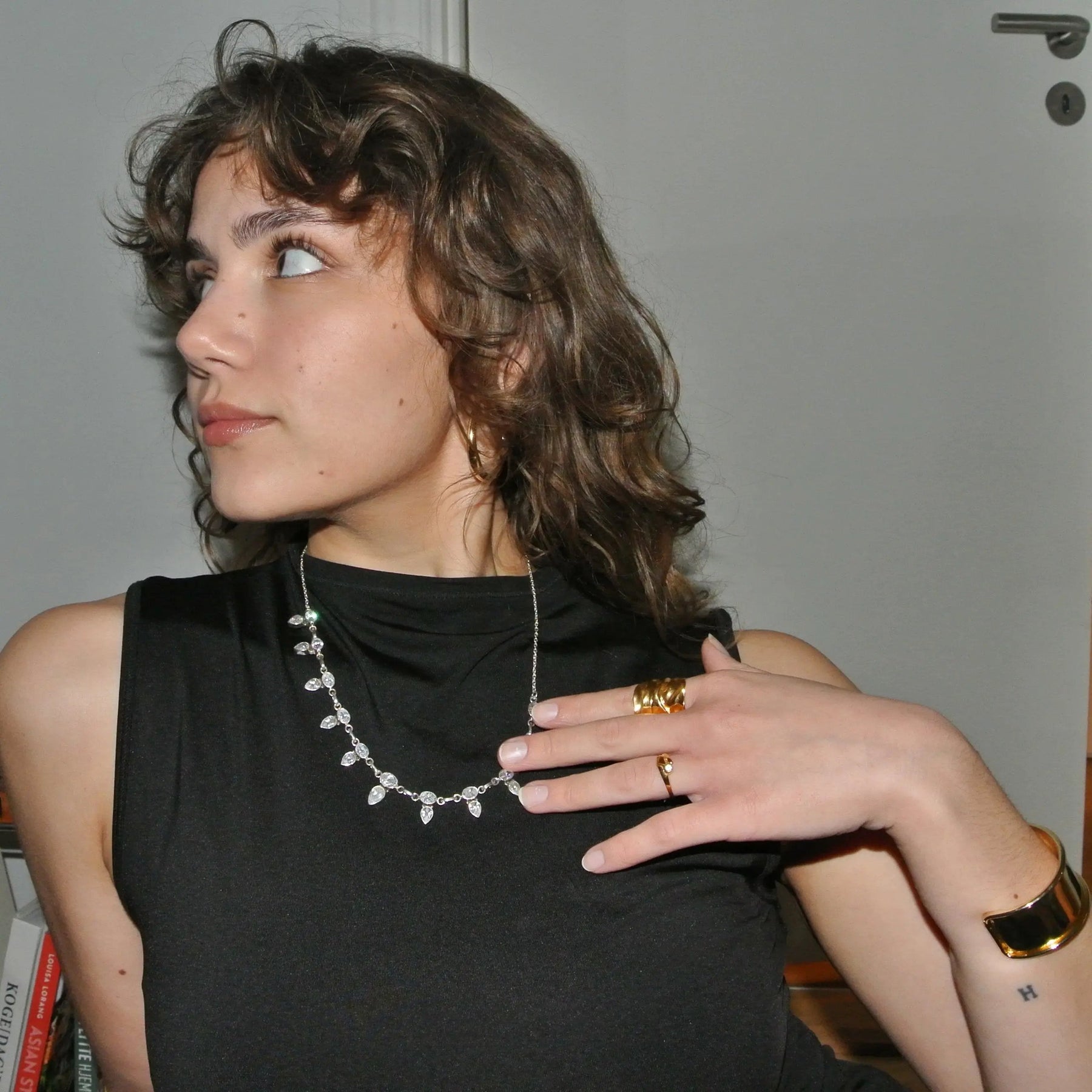 Mit einer Länge, die sicherstellt, dass eine perfekte Passform um den Hals ist, bieten diese Halsketten ein harmonisches Gleichgewicht zwischen Präsenz und Finesse. Sie können allein für einen unterspielten, eleganten Look getragen werden oder mit anderen Ketten geschichtet werden, um einen dramatischeren und persönlicheren Ausdruck zu erzielen. Egal wie Sie sie stylen, sie verleihen jedem Outfit einen Hauch von ausgefeiltem Glanz.
