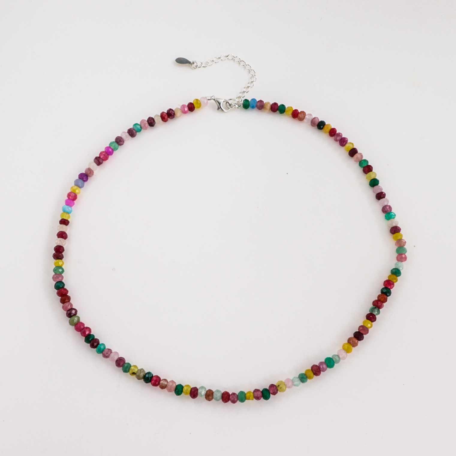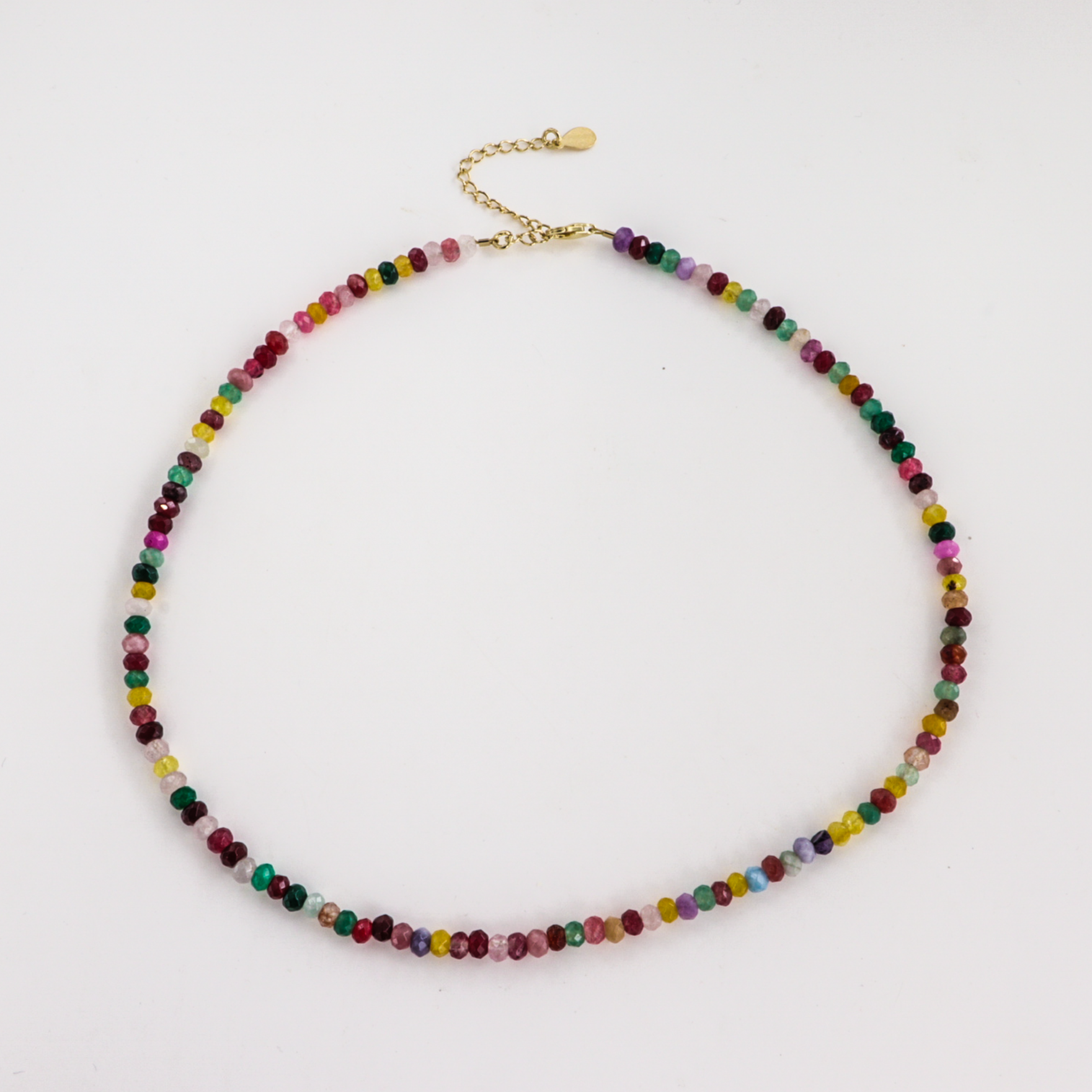 Farverig halskæde i facetteret mix agat – en sammensætning af smykkestensperler i flotte, nuancer som rød, blå, gul, rosa og grøn. De små rondel-formede perler er let facetterede, hvilket giver et diskret glimt og et organisk, levende udtryk.