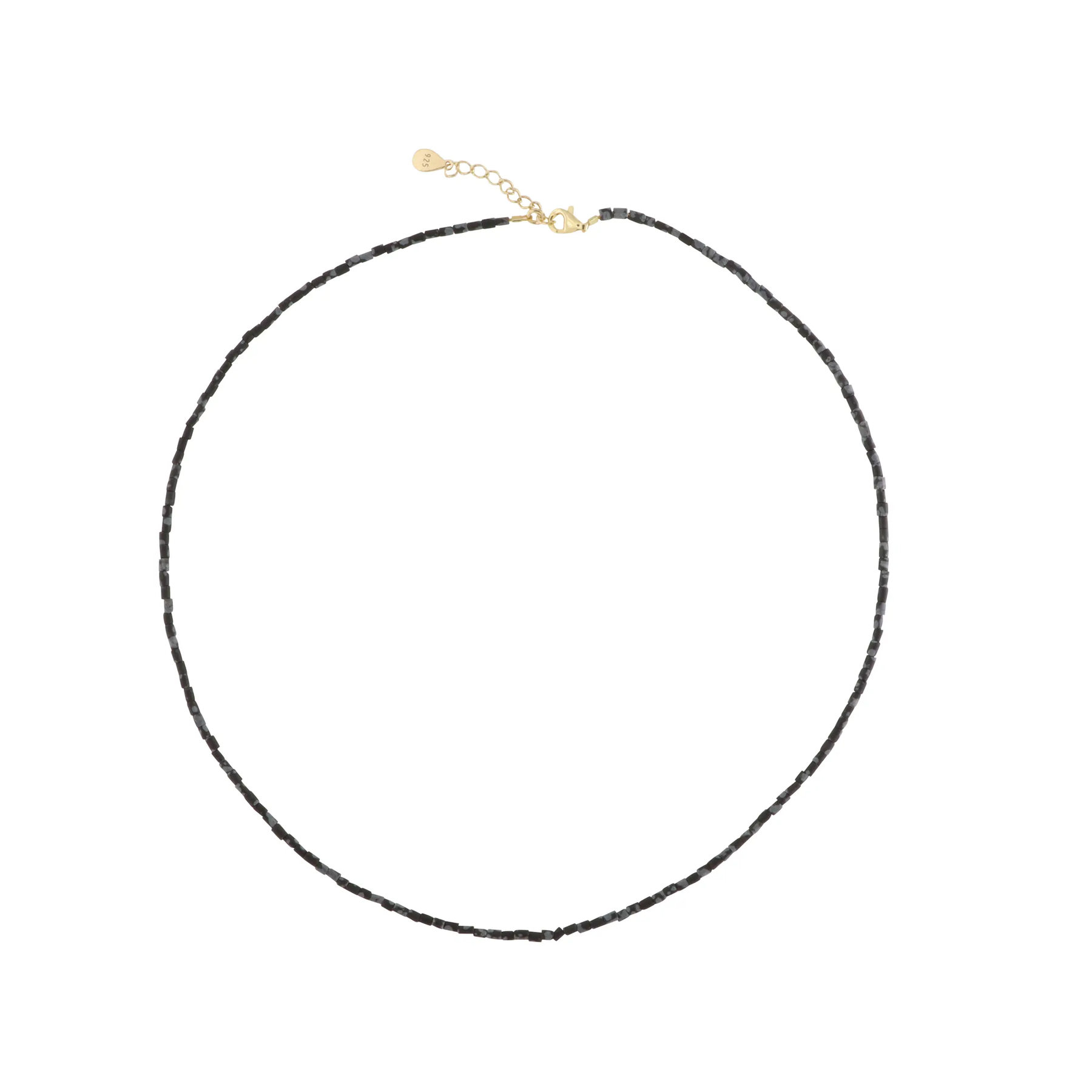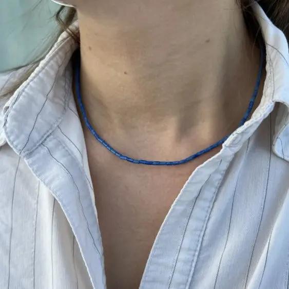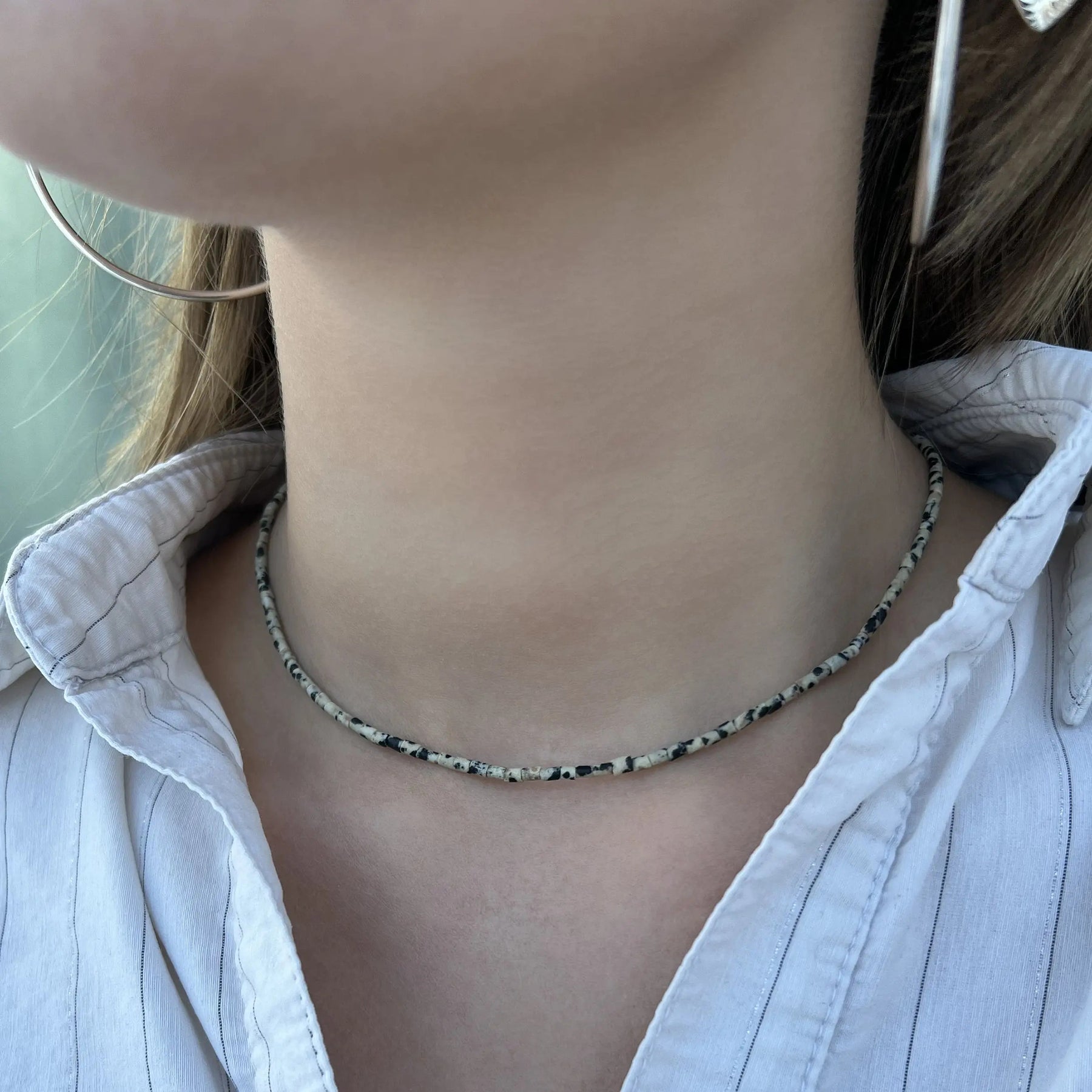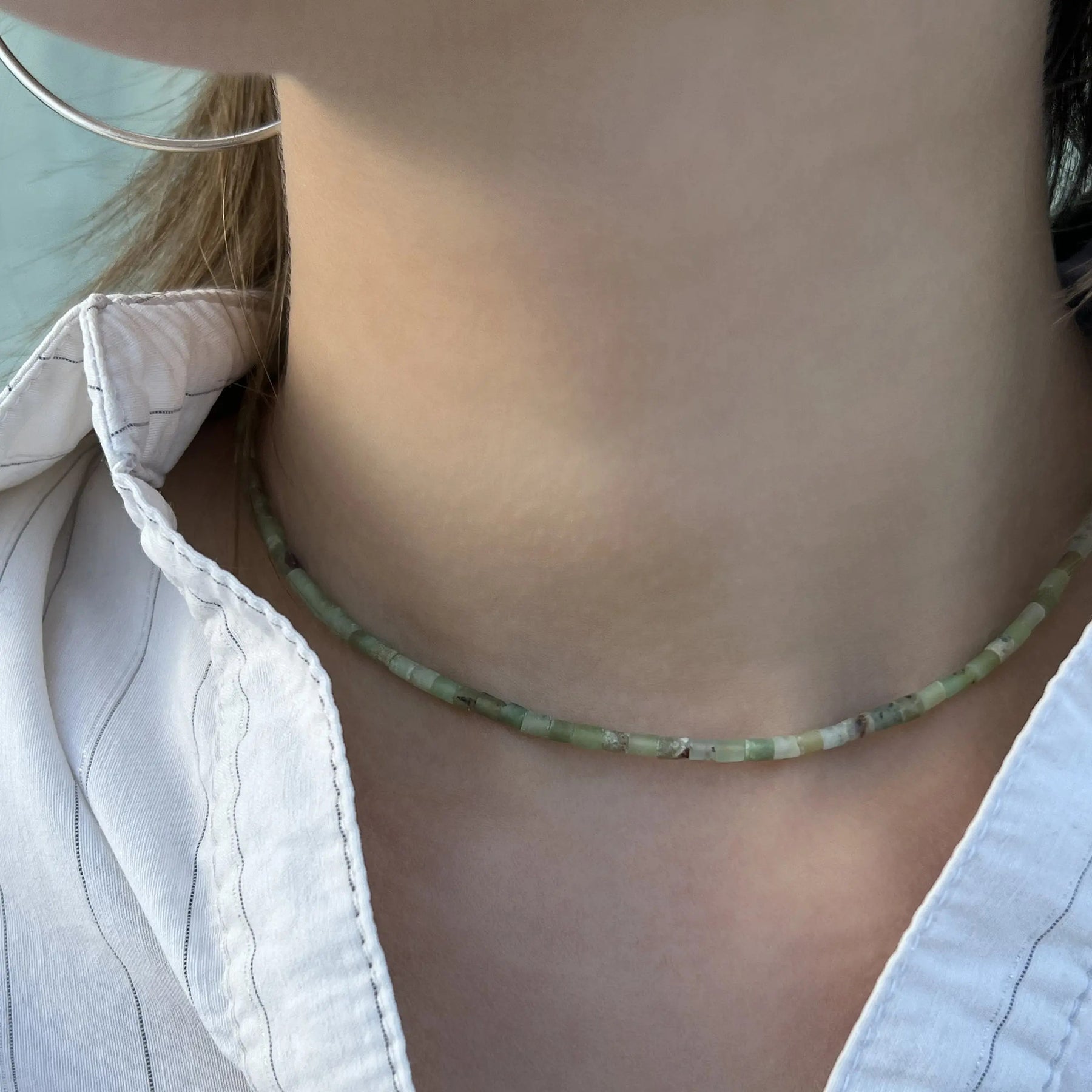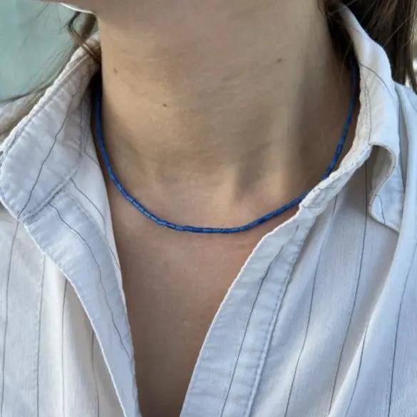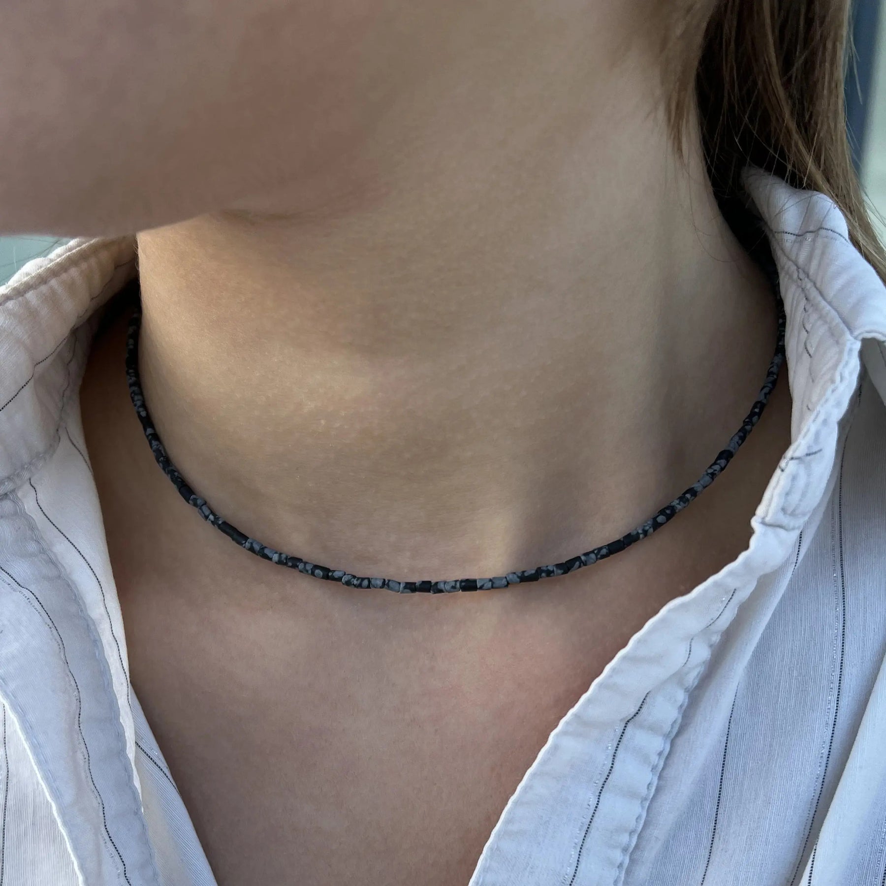 Verwöhnen Sie sich mit einer eleganten Halskette, die eine schöne Kombination von Pfeifenperlen in verschiedenen Edelsteinen darstellt, darunter Sodalit, Rhodonit, Chrysopras, Dalmatins Jaspis, Snowflake Obsidian und Türkis. Jede Halskette ist sorgfältig mit einem Schloss und einer Kettenverlängerung von Sterlingsilber oder vergoldetem Sterlingsilber ausgestattet, wodurch ein luxuriöses Finish und die Gewährleistung der Haltbarkeit verleiht.