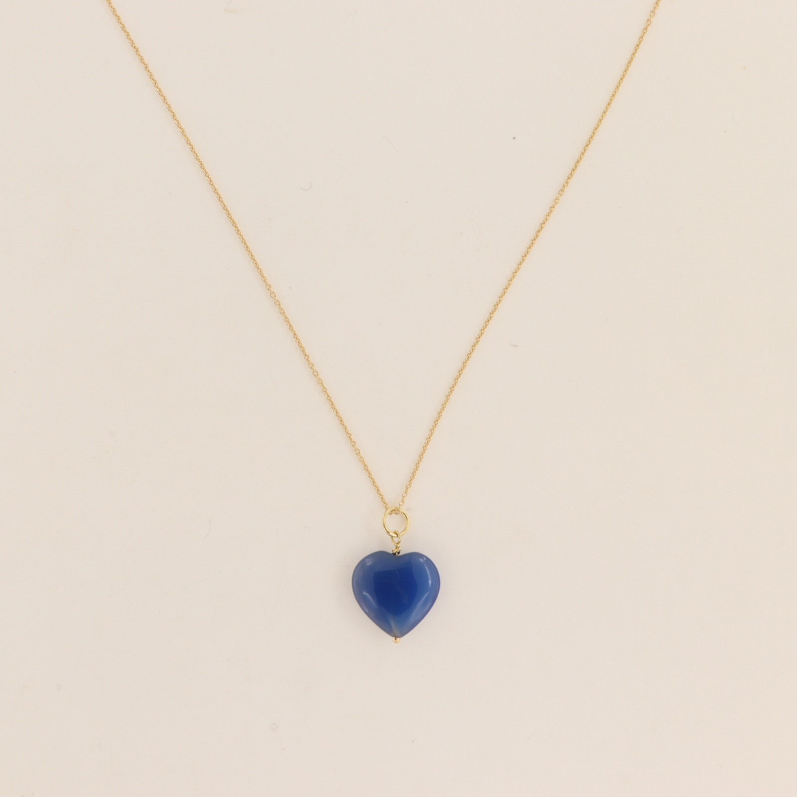 En elegant og tidløs halskæde i forgyldt sterlingsølv, designet med et smukt blåt ædelstenshjerte som vedhæng. Hjertet måler 1,5 x 1,5 cm og er monteret på en fin forgyldt sølv perlestav, der tilføjer et eksklusivt touch til designet.