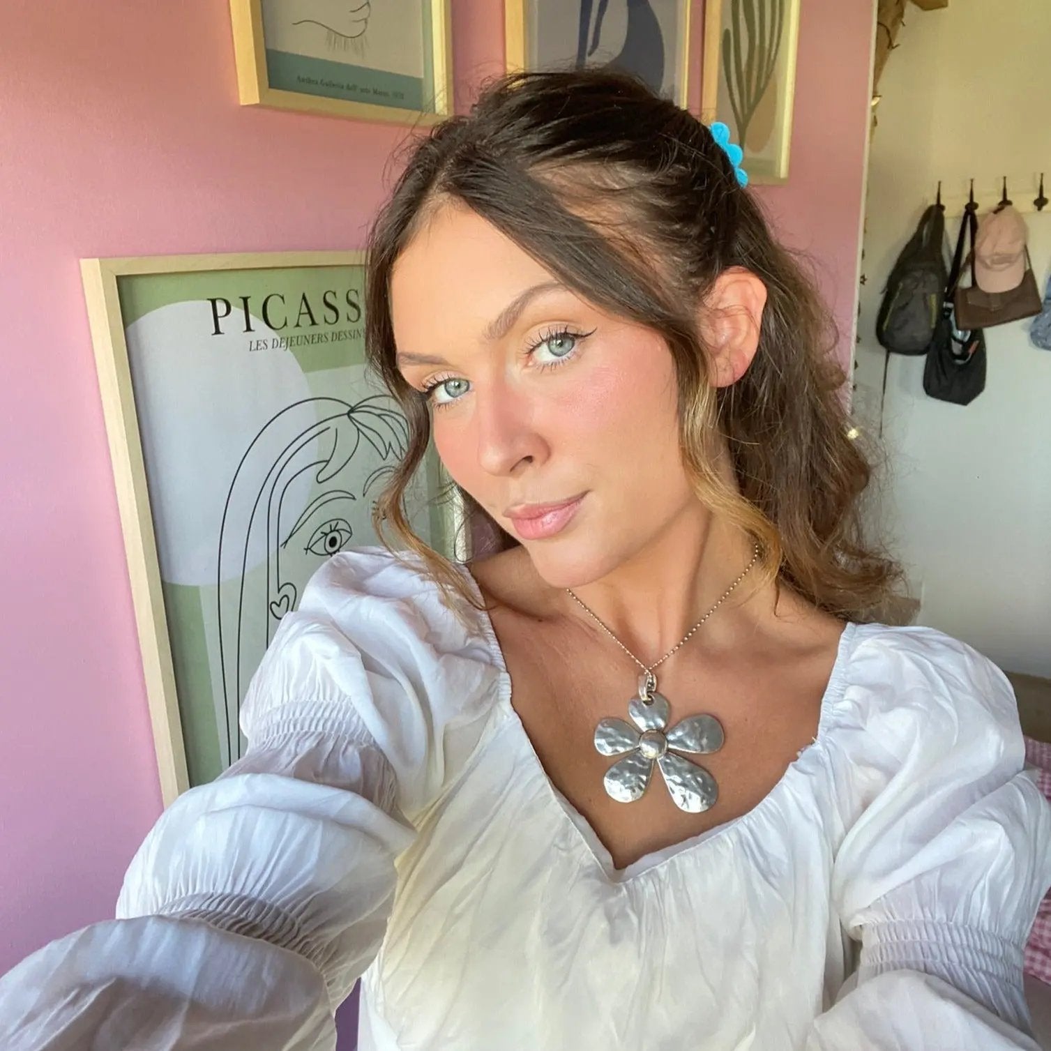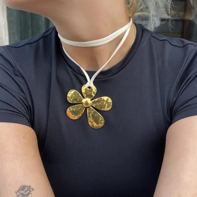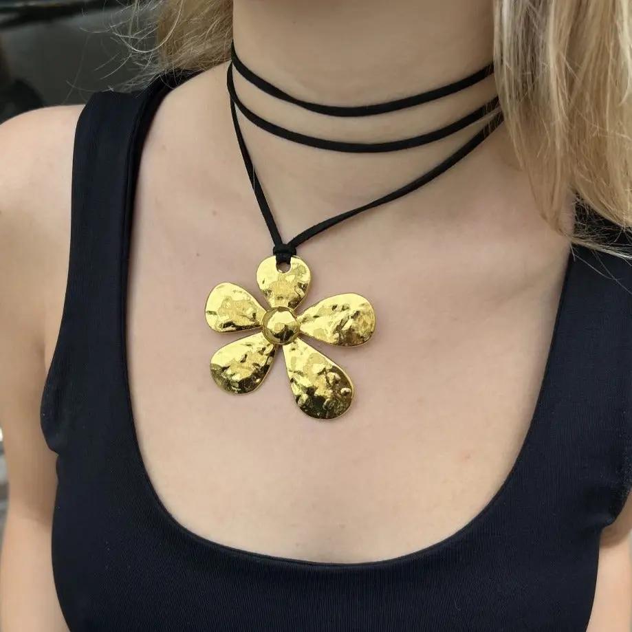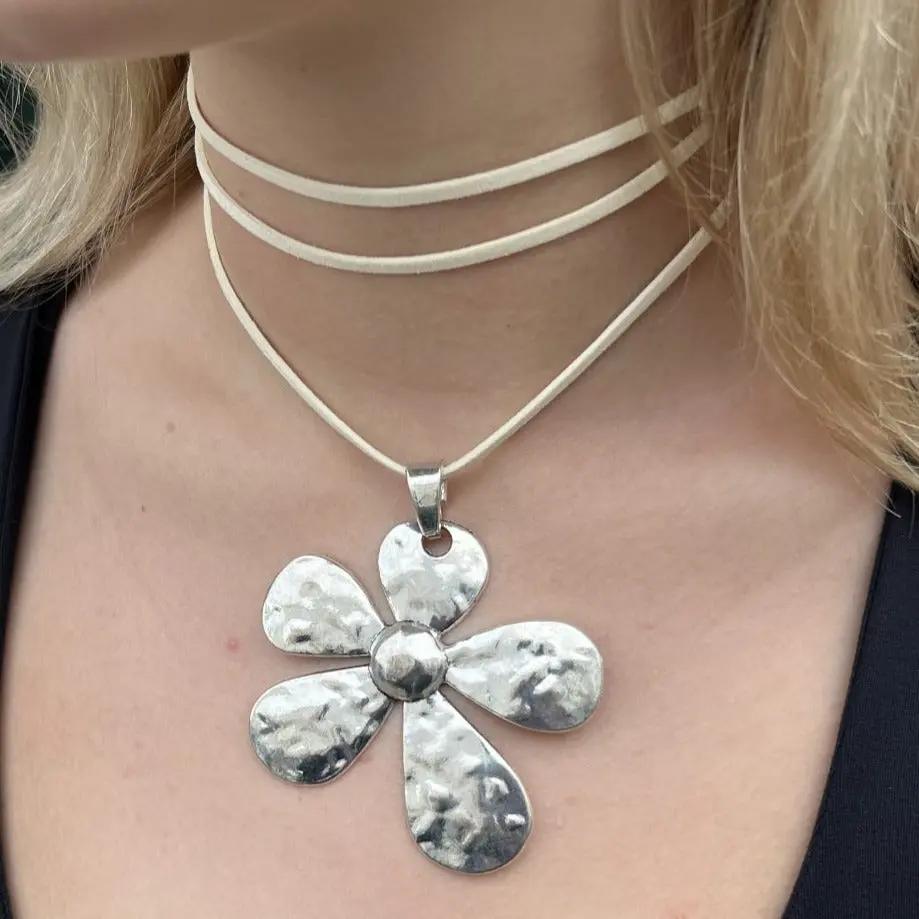 Entdecken Sie eine stilvolle und trendige Halskette mit einem wunderschönen Blumenanhänger, der sowohl in vergoldetem als auch in silberischem Eisen erhältlich ist, um Ihrem Outfit eine einzigartige Note zu verleihen. Dieses elegante Design hängt an einem weichen beige Wildlederschnur, das um den Hals gebunden und mit einer schönen Schleife im Nacken geschlossen werden kann. Die Saite hat eine Länge, mit der Sie sie zweimal um den Hals wickeln können, was Ihrem Styling eine zusätzliche Dimension verleiht.