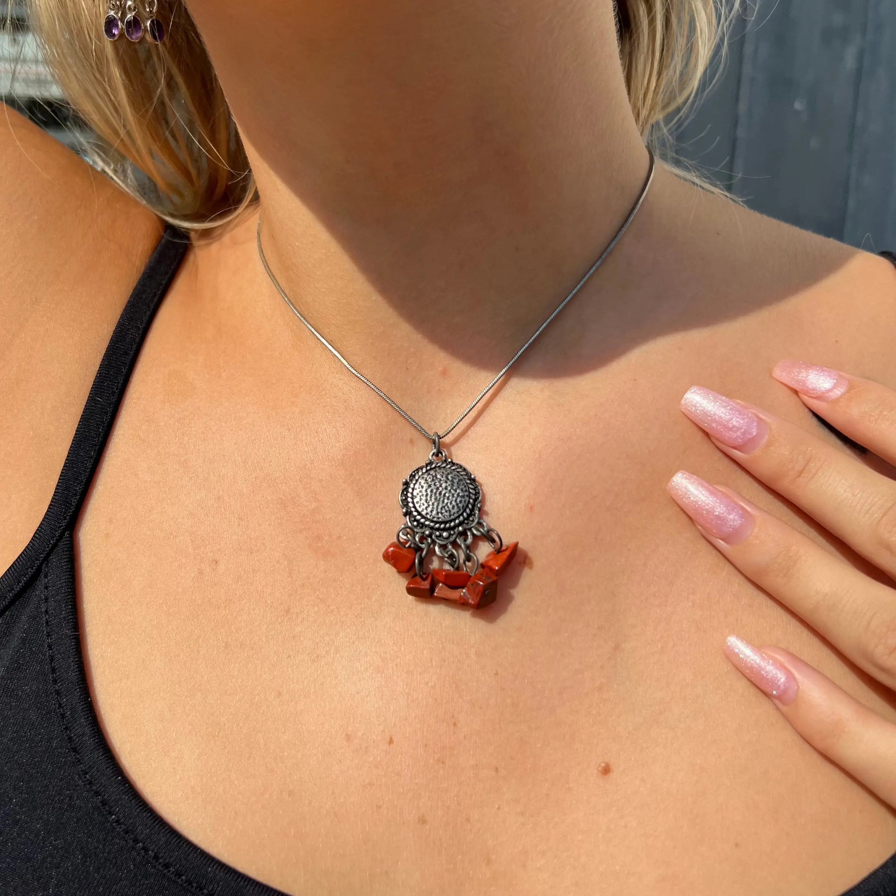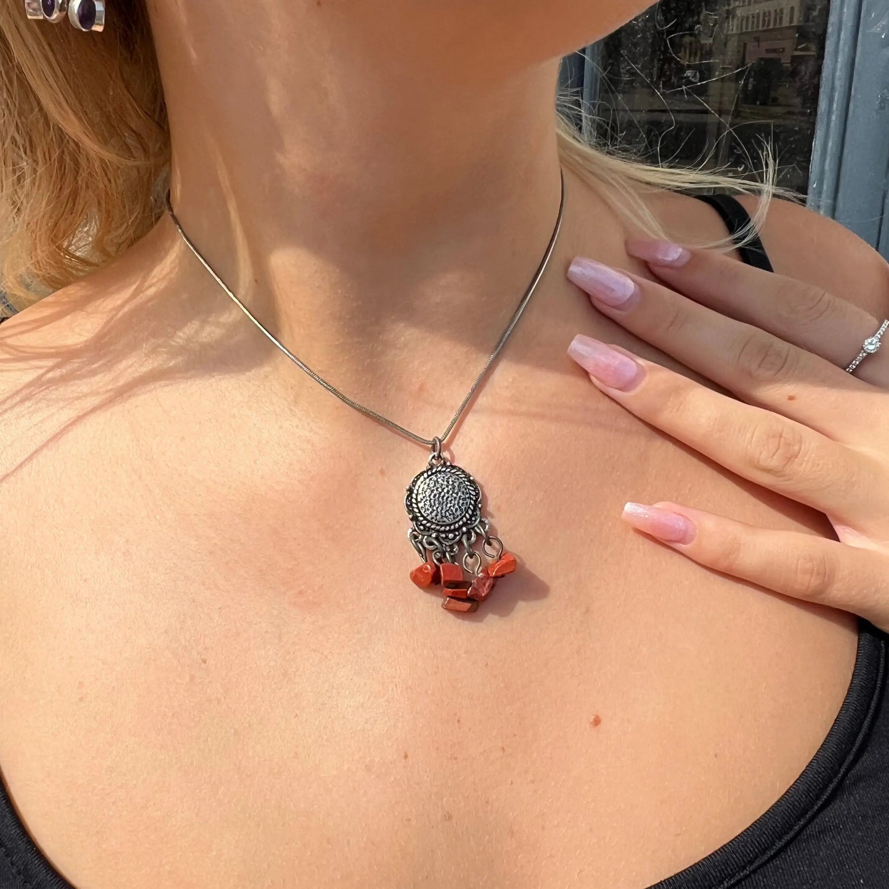 Die Halskette ist eine runde Venezia -Kette, die klassische Schönheit und Raffinesse ausstrahlt. Als Augenfokus hängt ein wunderschöner runder Anhänger aus der Kette, der mit kleinen, roten Steinen geschmückt ist.