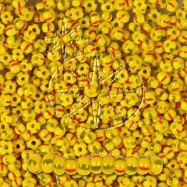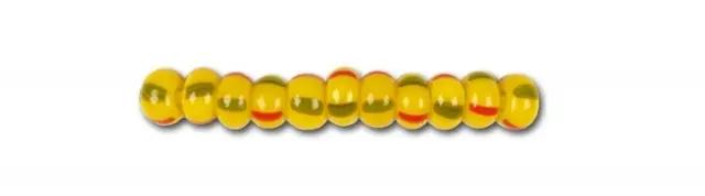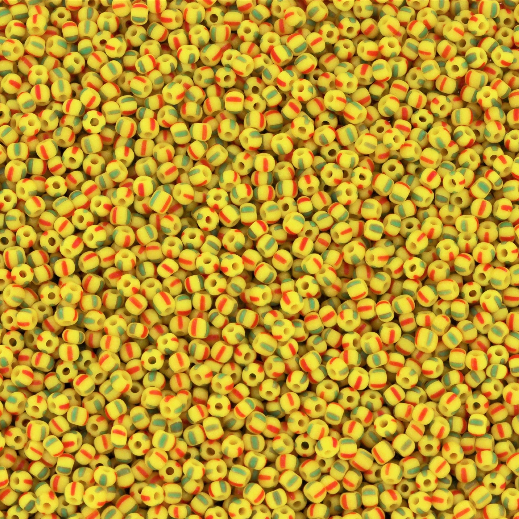 Kleine gelbe Glasperlen mit roten und grünen Streifen.