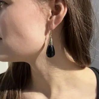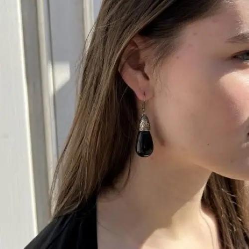 Ohrringe, Ohrhaken schwarzer Tropfen, silberverlagte Messing