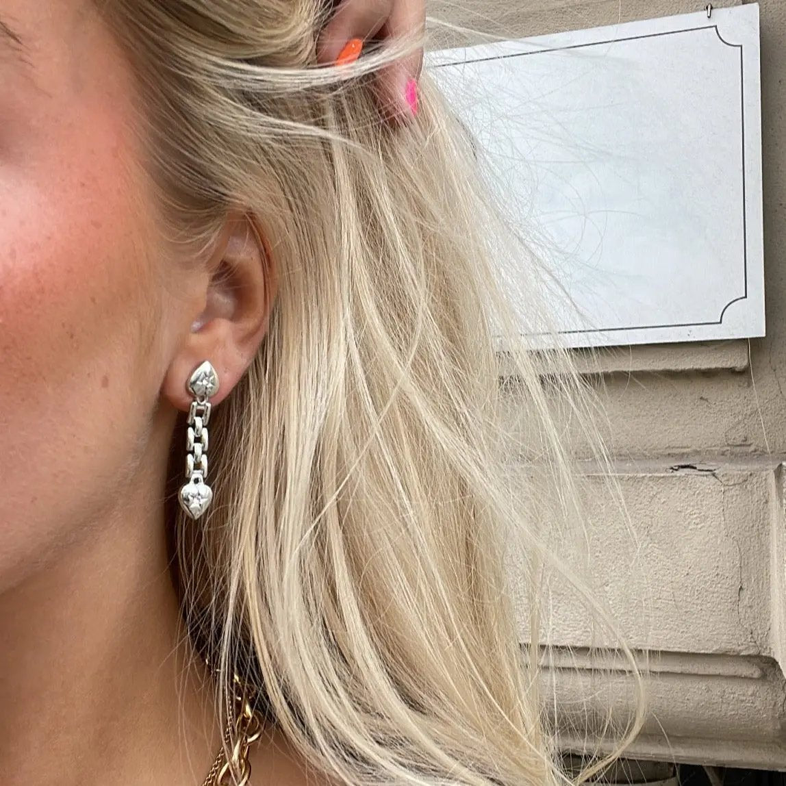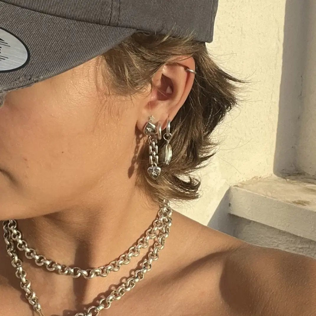 Ohrhörer aus silberischem Messing mit Motiven zweier Herzens, die mit einer Kette verbunden sind.