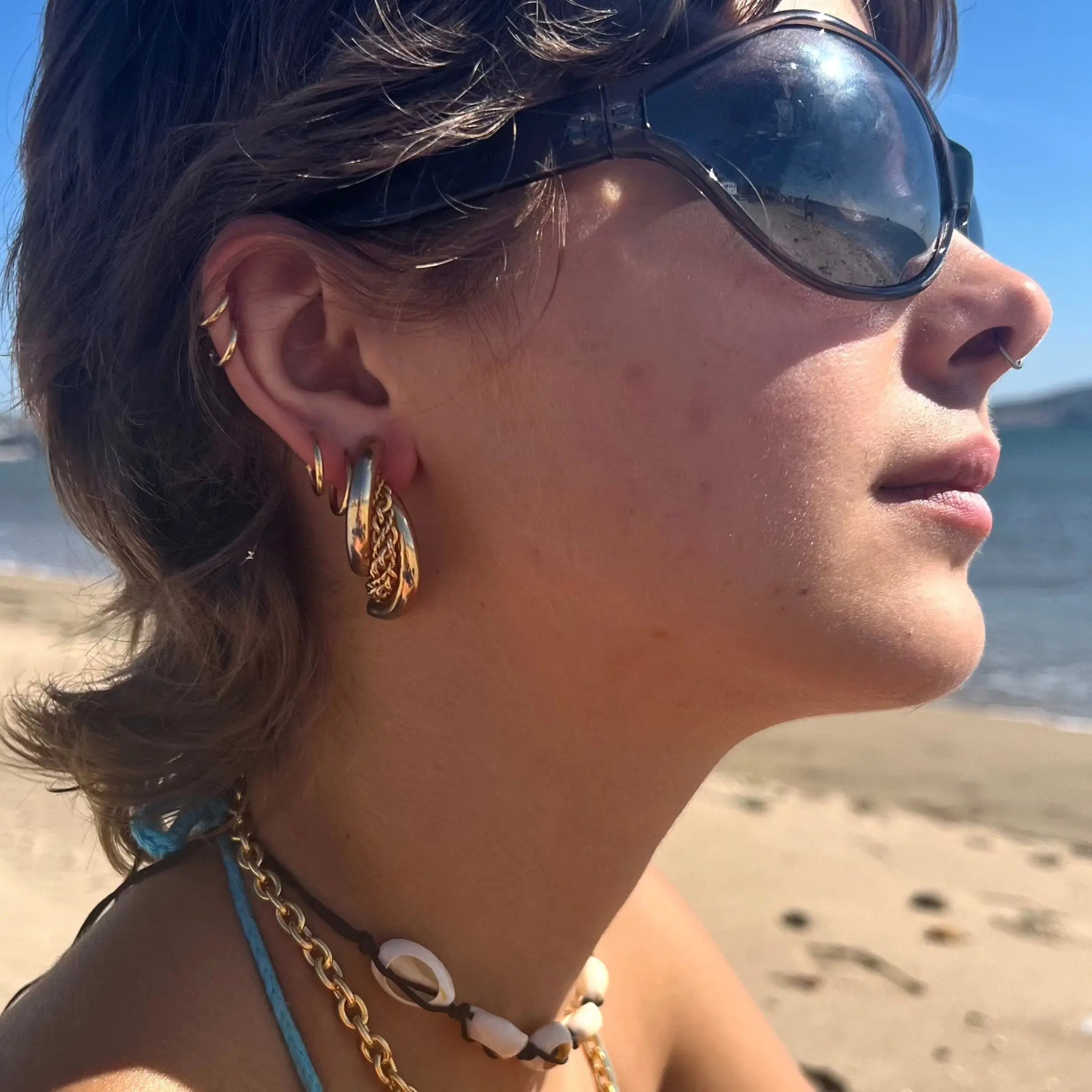 Diese eleganten Ohrringe bestehen aus vergoldetem Messing und haben ein einzigartiges gedrehtes Design, das jedem Look einen modernen Touch verleiht. Mit einem Durchmesser von 38 mm sind sie die perfekte Balance zwischen Einfachheit und Aussage