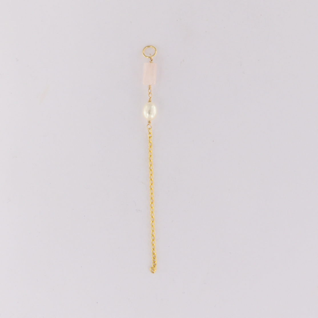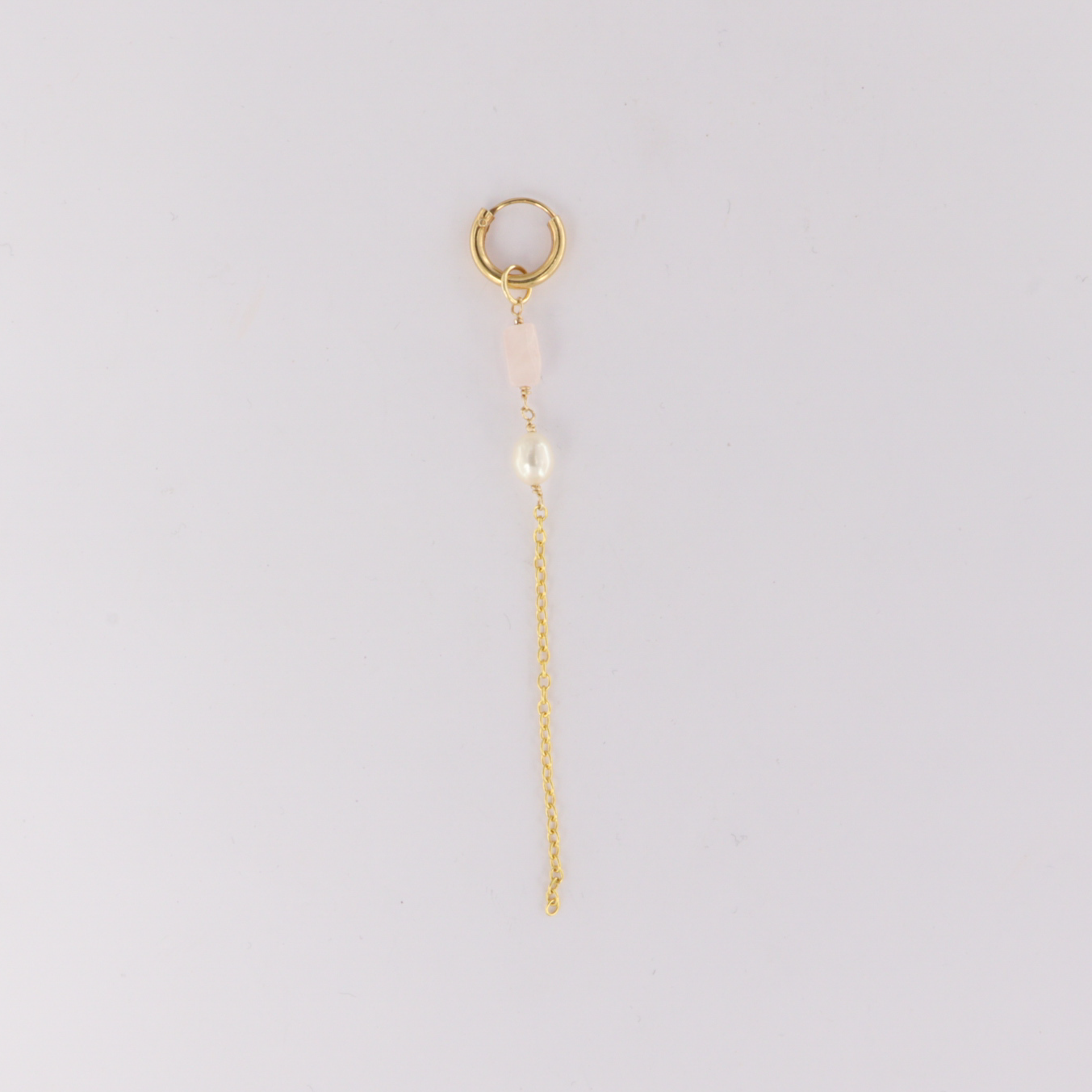 Disse fine øreringe er lavet i forgyldt sterlingsølv og måler 12 × 2 mm. Designet er kendetegnet ved en elegant dobbelt kæde, som giver let bevægelse og et feminint udtryk. Som smuk detalje har øreringene et vedhæng med en ferskvandsperle og en firkantet rosakvarts, der tilsammen skaber et blødt og harmonisk farvespil.