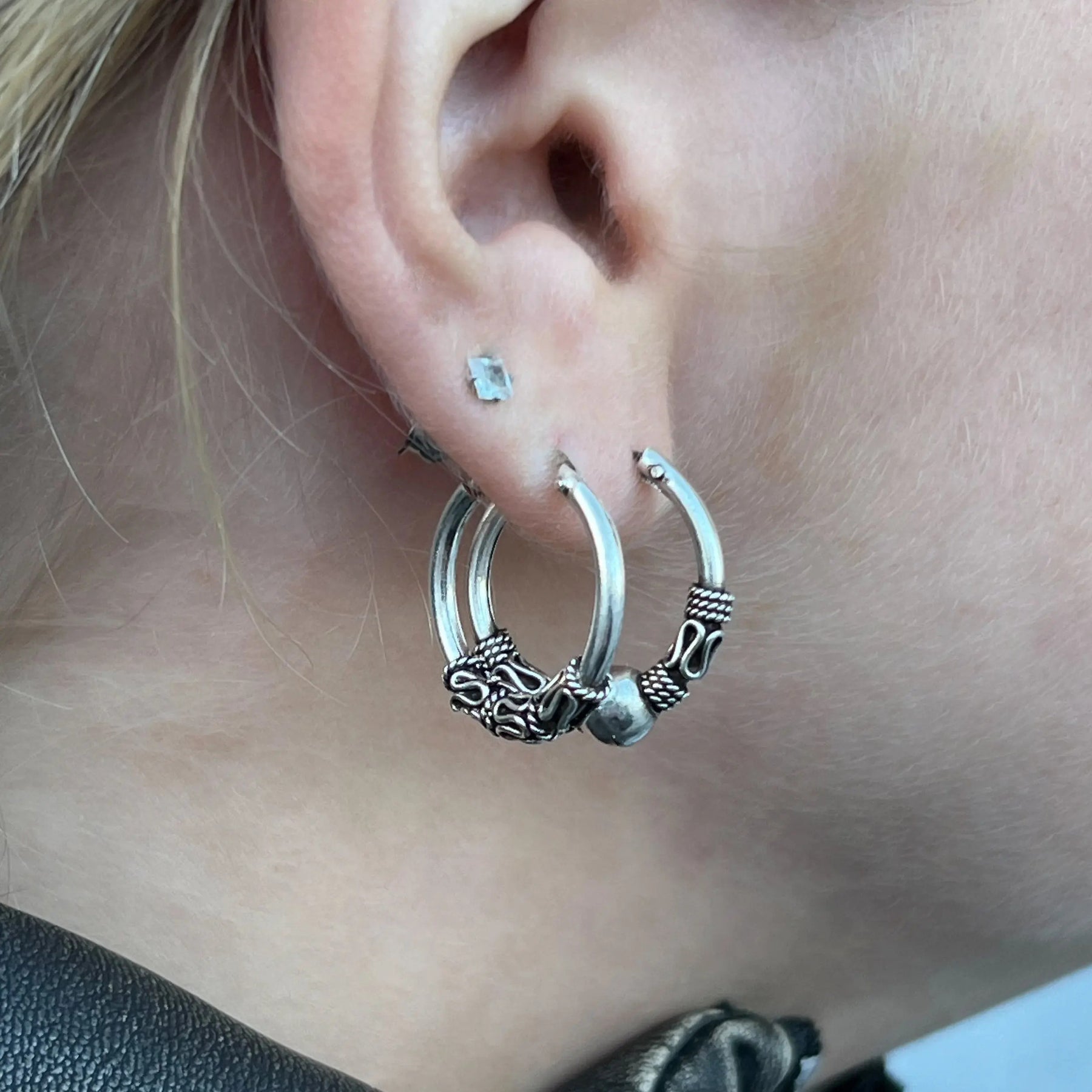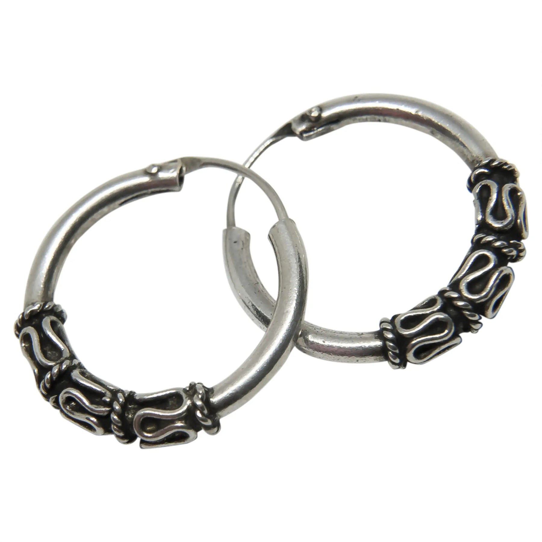 Erleben Sie die einzigartige Schönheit von ethnisch inspirierten Reifen, die das Beste aus Design mit oxidiertem Sterlingsilber kombinieren. Diese Ohrringe sind mit schönen Wicklungen und Wellen geschmückt, die einen eleganten und böhmischen Ausdruck verleihen. Perfekt für den Stil allein oder in Kombination mit unseren anderen großartigen Ohrringen verleihen sie jedem Kleid einen Hauch von Persönlichkeit und Stil.