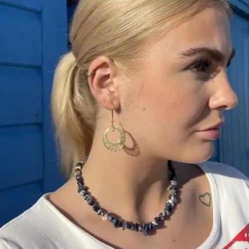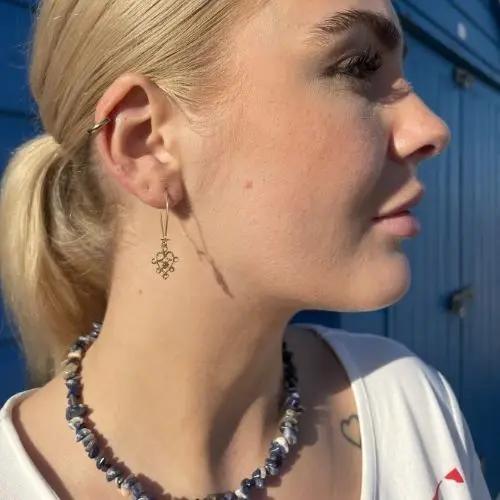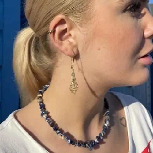 Diese Ohrringe können einzeln oder als Paare gekauft werden, sodass Sie die auswählen können, die am besten zu Ihrer Schmuckkollektion passt. Auf den Bildern sind die Ohrringe mit einer Ohrhälfte aus goldgeleichter Silber und einer Schmuckchip -Halskette in Sodalit gestaltet, wodurch ihre Vielseitigkeit und Schönheit hervorgehoben wird.