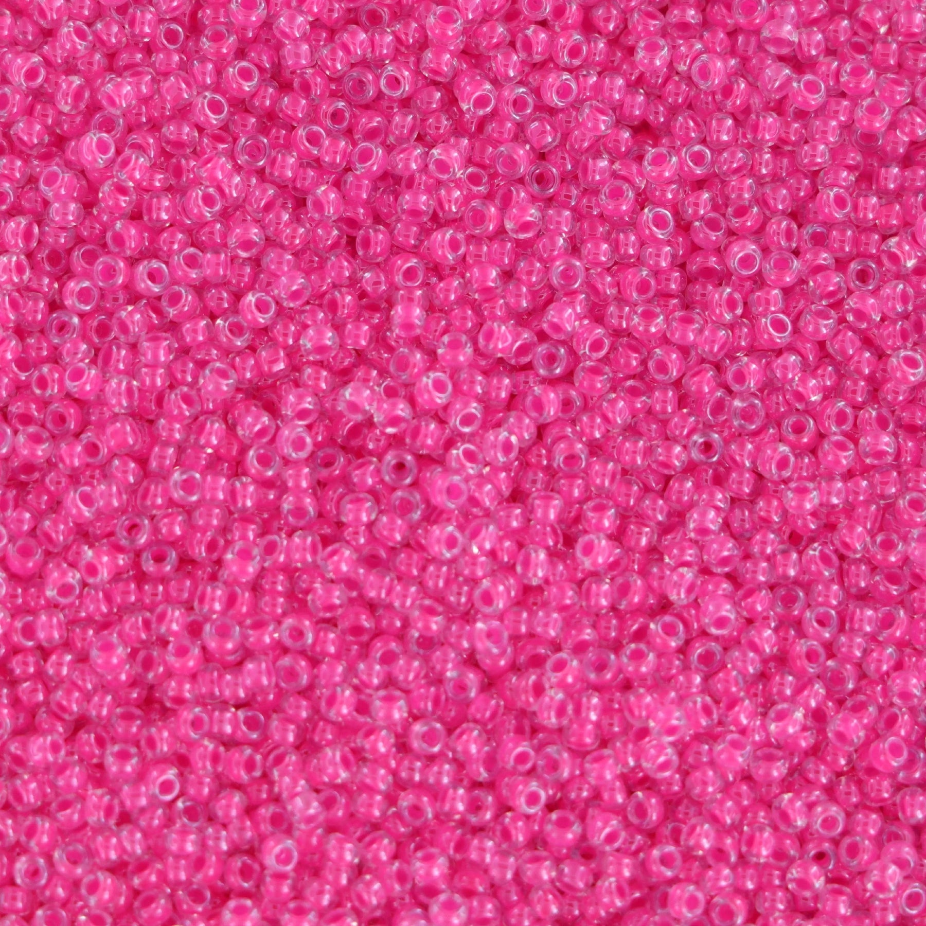 Miyuki Rocailles Glasperlen auch als bekannt als als seed beads oder grönländische Edelsteine.Kleine klare transparent Miyuki Rocailles Glasperlen mit rosa Futter und glänzende Oberfläche.