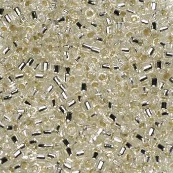Kleine klare transparent Miyuki Delica Pfeife -fehlgeschlagene Glasperlen mit Silberfutter und glänzender Oberfläche.