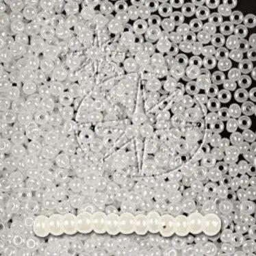 Kleine durchscheinende weiße Glasperlen mit Perlenmutter.